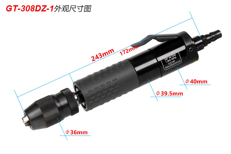 • 產(chǎn)品參數(shù): 夾頭尺寸:3/8" 【1-10mm】 馬達(dá)功率:0.5HP 空載轉(zhuǎn)速:1900rpm 全 長(zhǎng):243mm 重 量:1.04kg 耗 氣 量:0.69m3/min 【工業(yè)型】