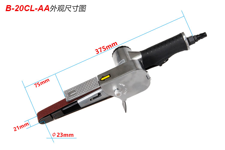 • 產(chǎn)品參數(shù): 砂帶尺寸:20*520mm; 空載轉(zhuǎn)速:18000rpm; 馬達(dá)功率:0.5hp 工具長度:375mm; 工具重量:1.46kg; 耗 氣 量:0.15m3/min; 使用工作氣壓:0.65Mpa; 推薦使用內(nèi)徑8mm氣管; 平時使用應(yīng)多加氣動油保養(yǎng). 【工業(yè)型/下開關(guān)】